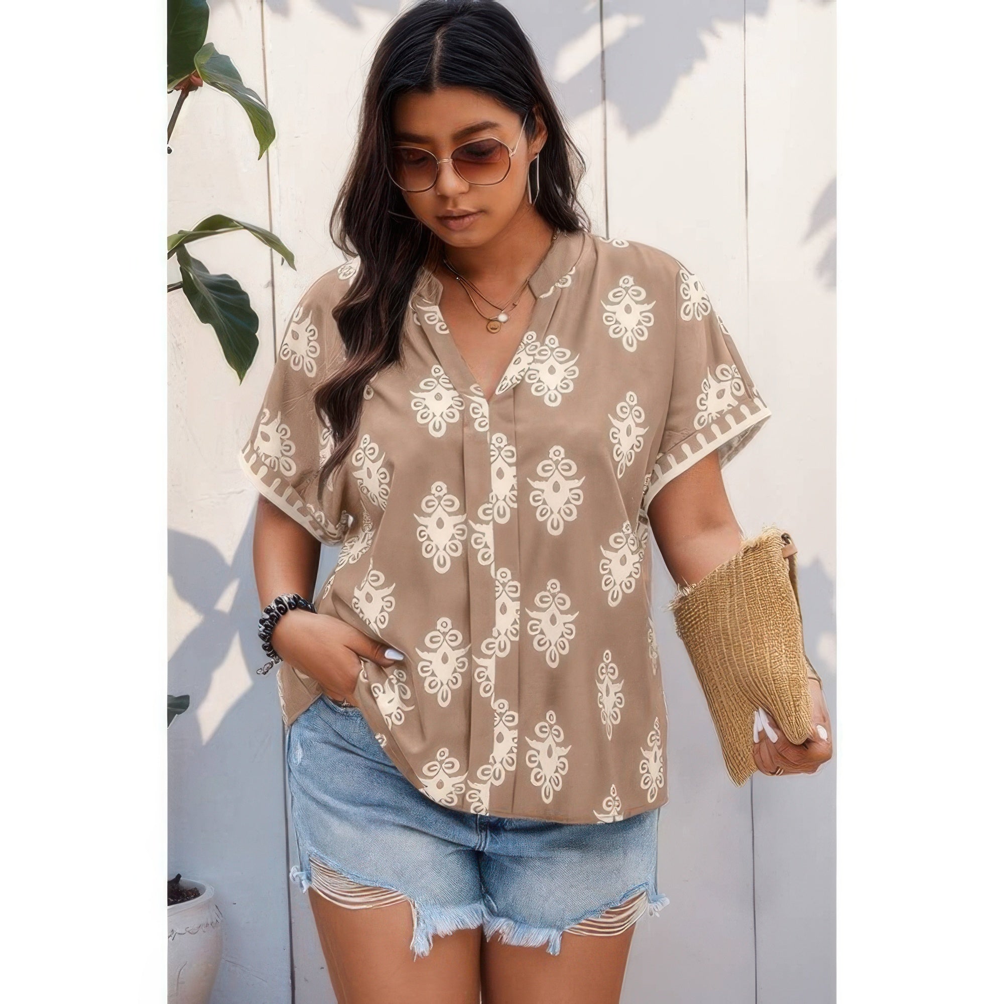 Easy, breathable, and full of charm, this Plus Size Short Sleeve V-Neck Printed Blouse is a wardrobe staple designed for comfort and effortless style. The V-neckline flatters the neckline, while the short sleeves offer relaxed coverage. Featuring an allover print, this blouse brings a vibrant touch to your everyday looks. Crafted from a soft polyester-elastane blend, it offers gentle stretch and a comfortable drape. Perfect for casual outings, workdays, or vacation wear, it's a versatile piece you'll reach for again and again.